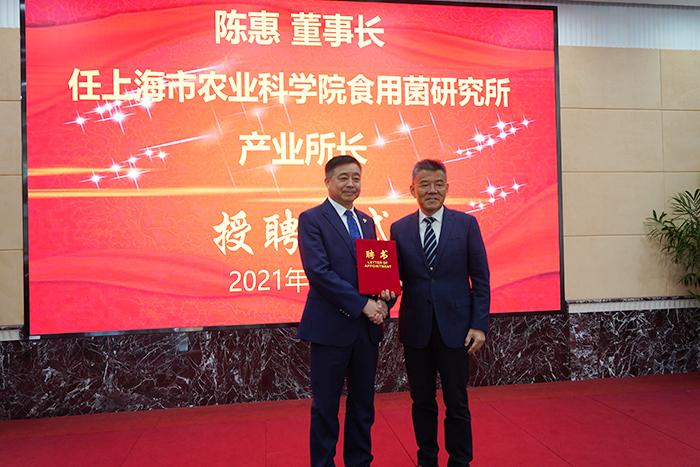 2021年3月22日,上海市農(nóng)業(yè)科學院食用菌研究所與江蘇安惠生物科技有限公司共同成立“聯(lián)合科技創(chuàng)新中心”舉行揭牌儀式。會上,安惠公司董事長陳惠受聘該院食用菌研究所產(chǎn)業(yè)所長。