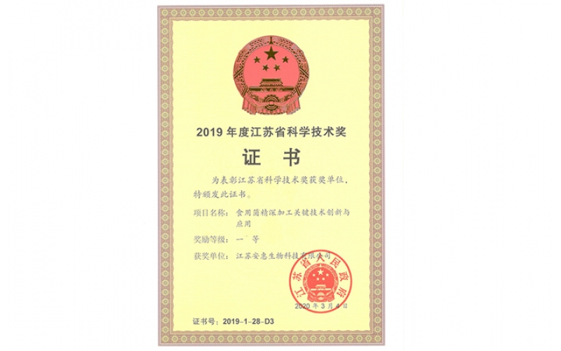 2020年3月,由江蘇安惠生物科技有限公司參與南京財經(jīng)大學、南京農(nóng)業(yè)大學、中國農(nóng)業(yè)大學等科研院所承擔的食用菌精深加工關(guān)鍵技術(shù)創(chuàng)新與應(yīng)用榮獲江蘇省科學技術(shù)獎一等獎。