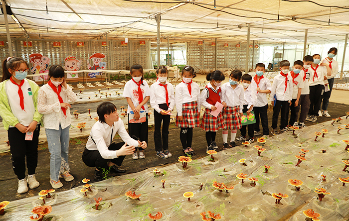 在安惠江海志愿者陳駿驊的帶領(lǐng)下,孩子們來到蕈菌園近距離觀看靈芝寶寶的栽培和生長。初夏時(shí)節(jié),蕈菌園里的靈芝初長成,嬌白嫩黃,亭亭玉立,孩子們?nèi)滩蛔】匆豢础⒚幻⒙勔宦劊惺苓@些精靈們的美好和神奇。靈芝是怎么長出來的?多久可以成熟?千年靈芝真的存在嗎?孩子們邊參觀邊提問,靈芝文化的種子在心中悄然播種。