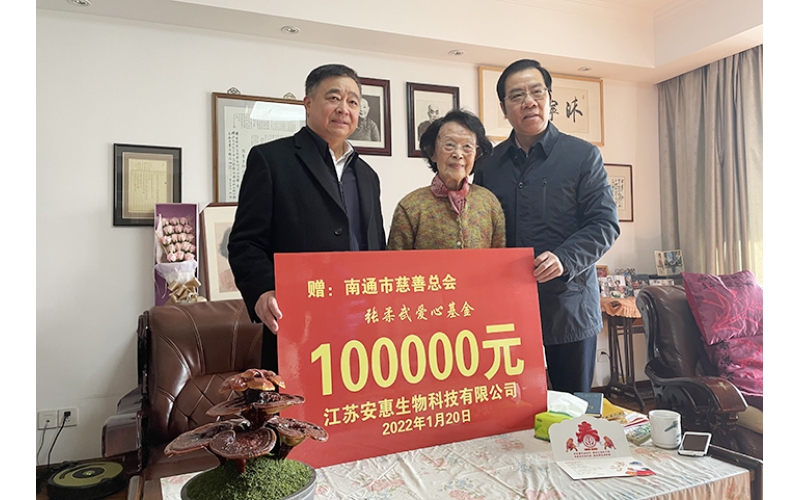 2022年1月20日,安惠公司董事長陳惠、南通市慈善總會(huì)副會(huì)長葉沈良來到張柔武老人家中,通過安惠健康公益基金向張柔武愛心基金捐贈(zèng)10萬元,助力“情暖江海”春節(jié)慰問活動(dòng)。